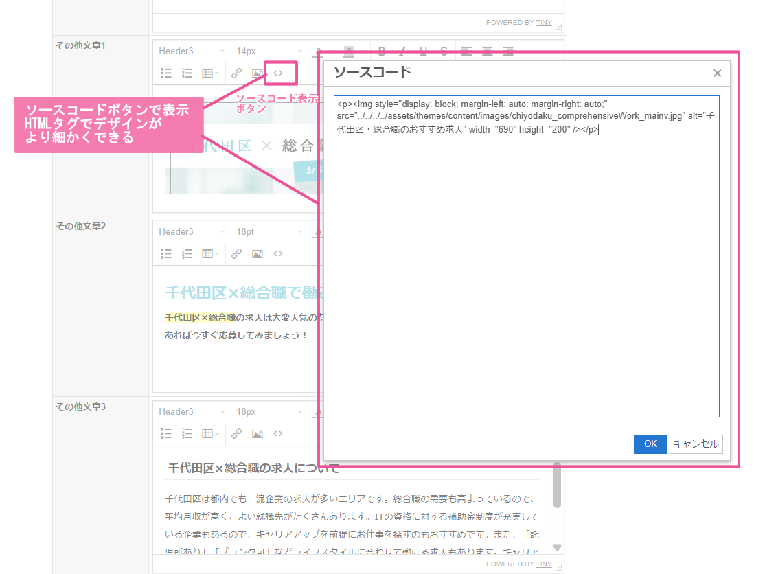「コードエディター」(参考画像)を利用することで、HTMLタグを直接入力することができます。