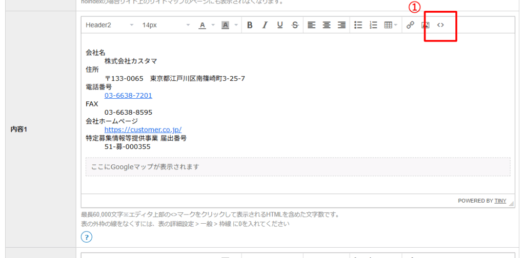 新しく追加するページの場合は、右上の新規登録をクリックしてください。 - 内容1~5の項目のエディタのソースコードボタン(①)をクリックします。