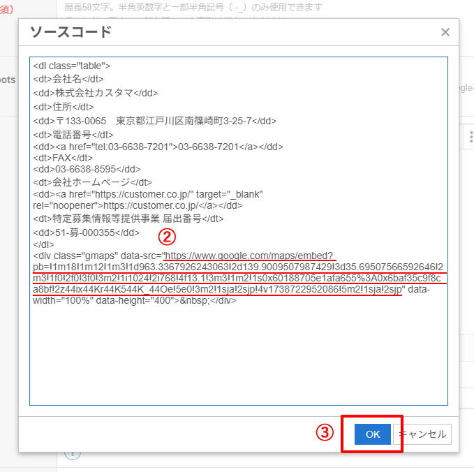- HTMLコードが表示されるので、下線部(②)を書き換えます。(具体的な方法は後述します)
