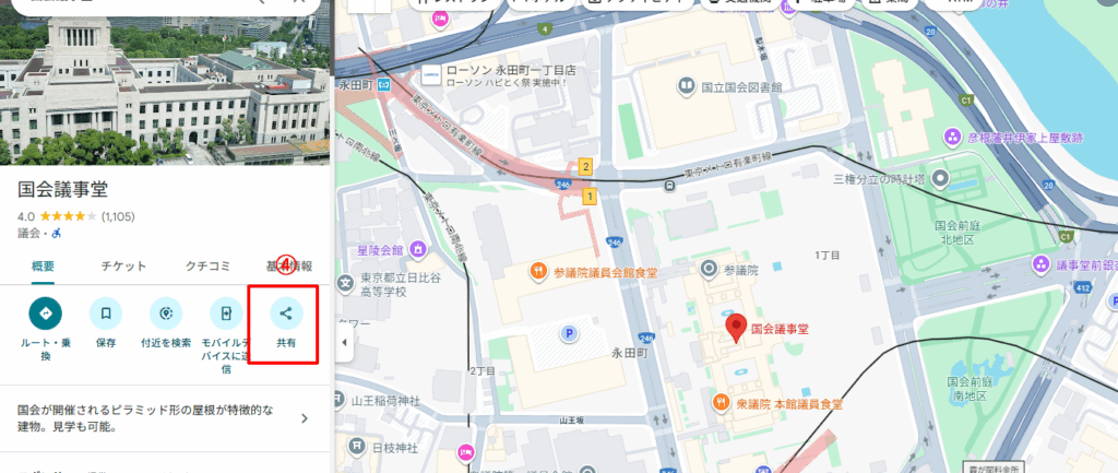 - 表示された地図の左側の共有ボタン(④)をクリックします。