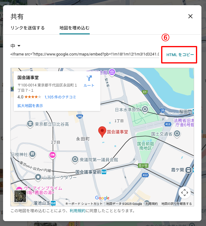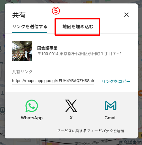 - 小さいウィンドウが表示されるので地図を埋め込むタブ(⑤)をクリックします。