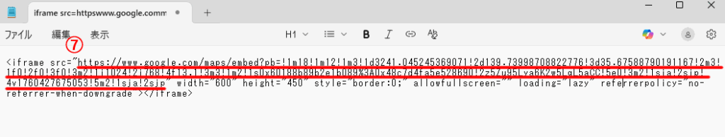 - ソースコードの②部分をメモ帳の⑦部分に書き替えます。